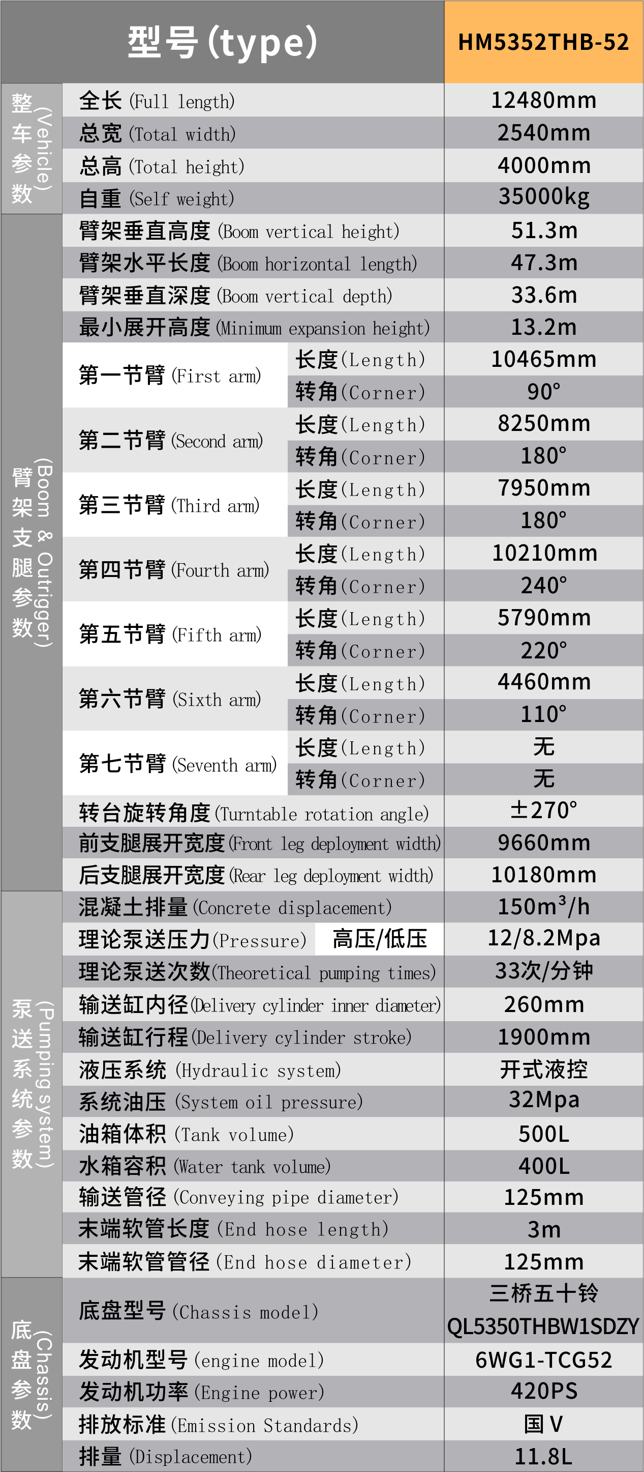 HM5352THB-52三橋52米國五五十鈴底盤泵車是一款承載能力強,動力性能好、油耗低,操作簡單可靠的泵車。