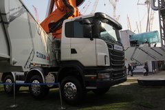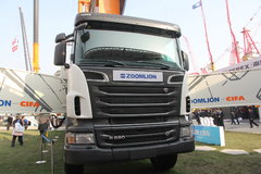 中聯(lián)重科 101米混凝土泵車采用斯堪尼亞底盤,泵送排量245方/小時,泵送壓力7.5/12 Mpa,整車全長高達15.5米,采用7軸14x4的驅(qū)動形式。中聯(lián)重科在該車基礎(chǔ)上進行了上裝的打造,采用7節(jié)臂輸送臂,其中最后4節(jié)使用了碳纖維制成。